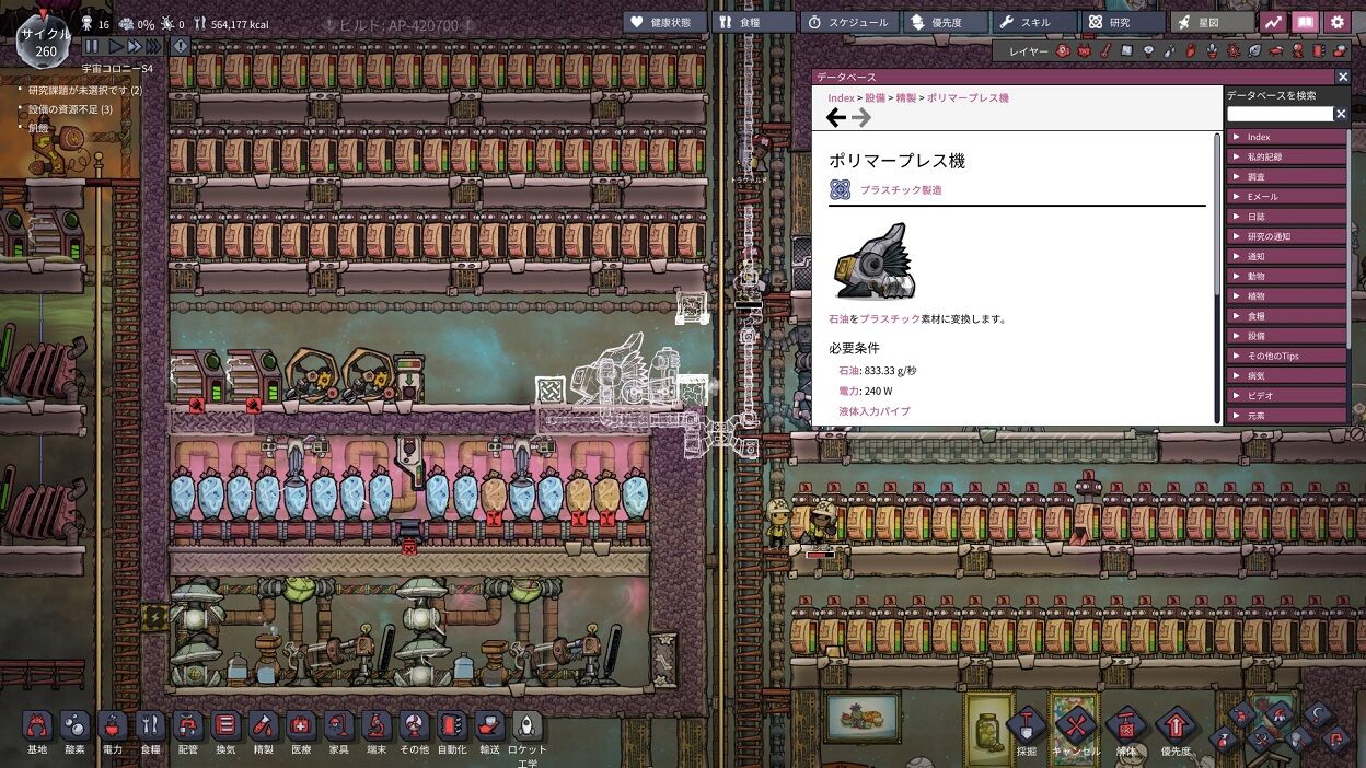 Awef على تويتر Oxygen Not Included サイクル700 コロニー自体はほぼ安定動作に入ったので プラスチック量産のために下に向かって掘り始めた 酸素の製造量がギリギリっぽいので 次はその辺の強化が必要